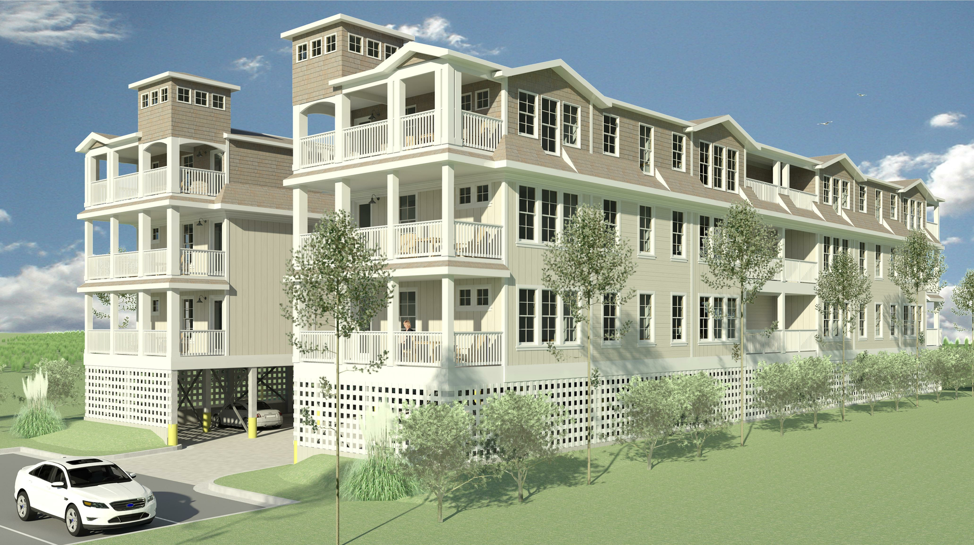 Designed to replace a 1970s era building destroyed by fire, this 15-unit building maximizes use of its site. Even the westernmost units will have ocean views from every primary room. The exterior design conforms to certain Kill Devil Hills Town standards which in turn allow greater height.